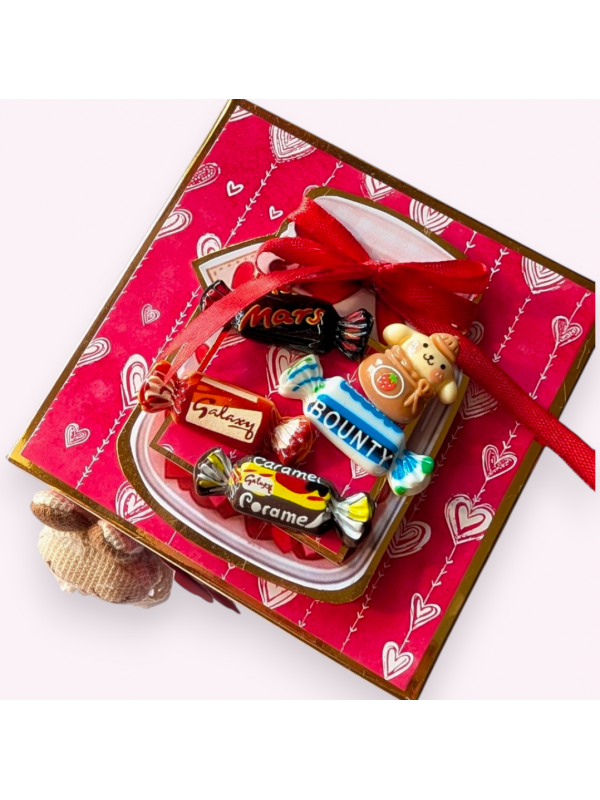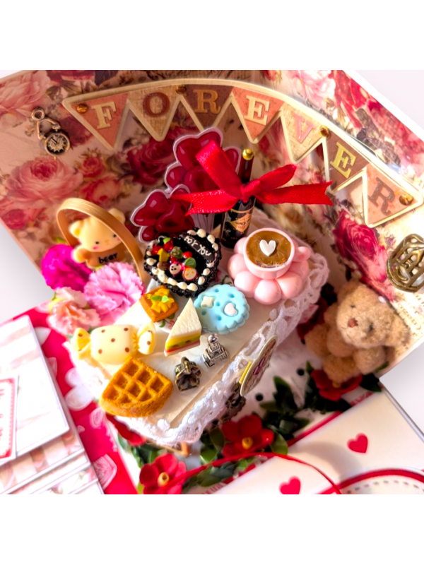 The cute miniatures include complete romantic setup like cakes, snacks, flowers, teddy bear and many more. Its a very cute piece of pure handcrafted luxury.