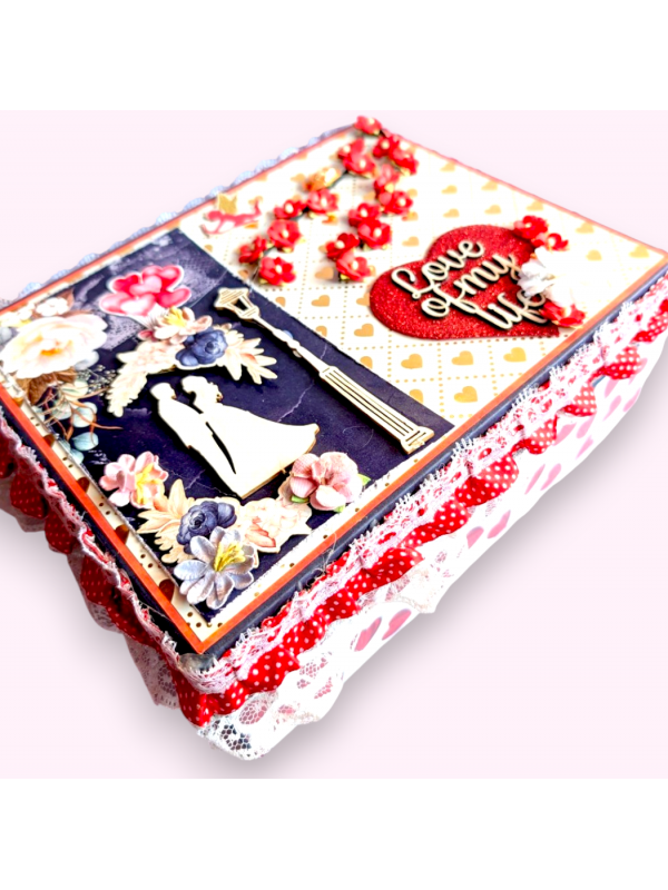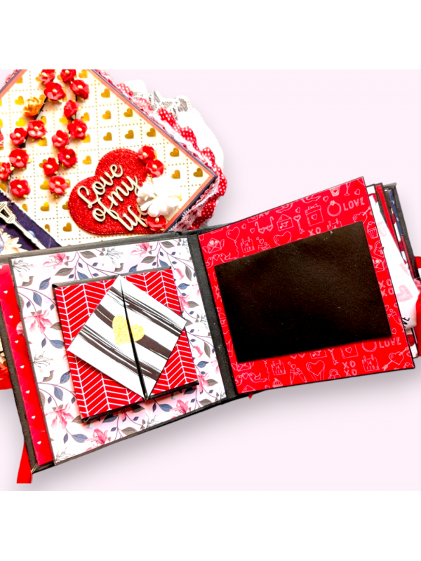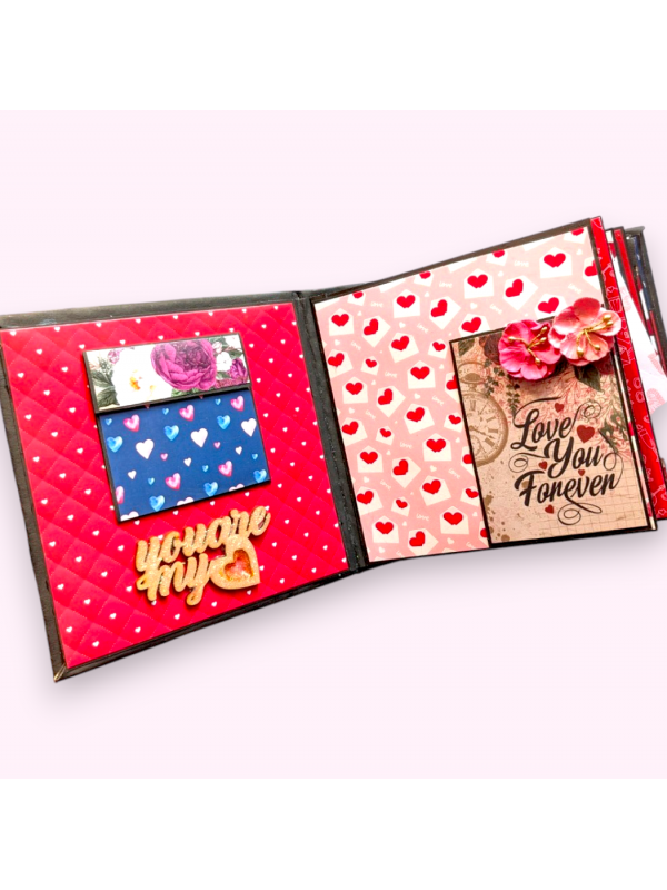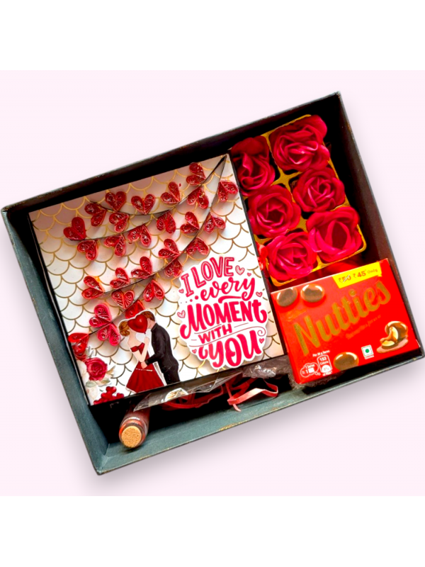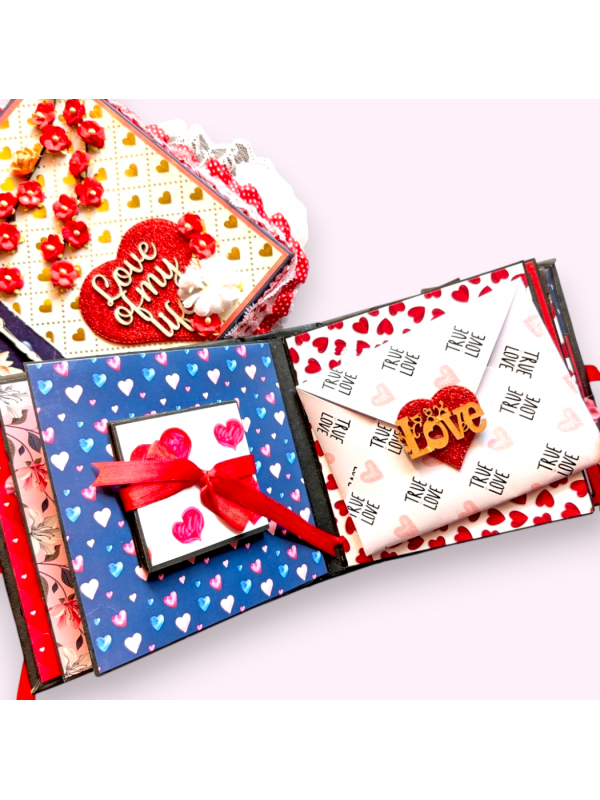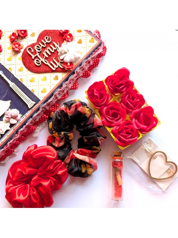 Love themed Hamper Box which includes a scrapbook , 2 scrunchies, chocolate, rose soap papers, a heart clip and a mini glass bottle letter