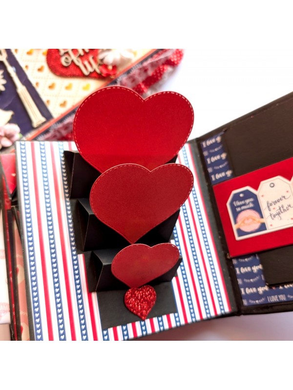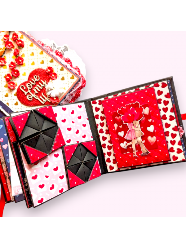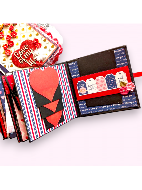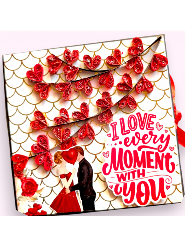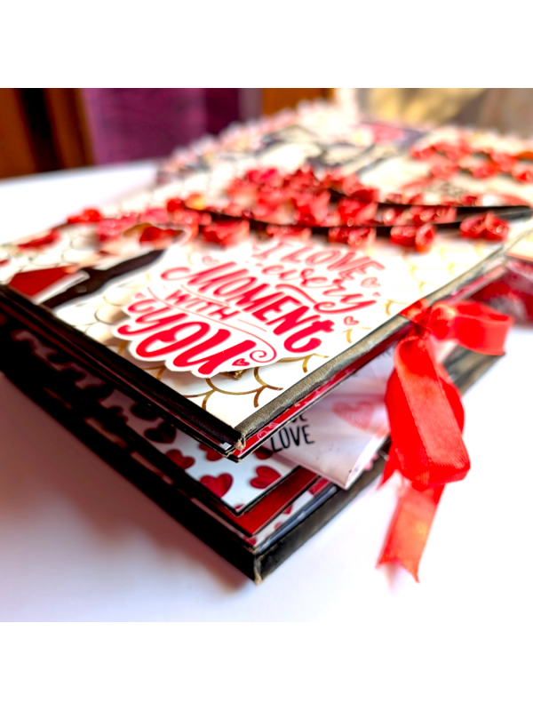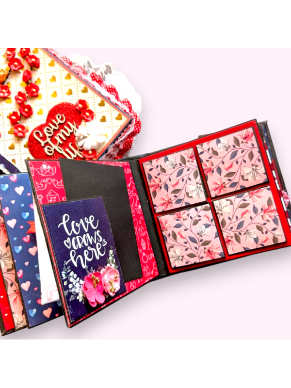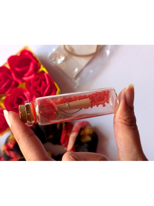 Love themed Hamper Box which includes a scrapbook , 2 scrunchies, chocolate, rose soap papers, a heart clip and a mini glass bottle letter
