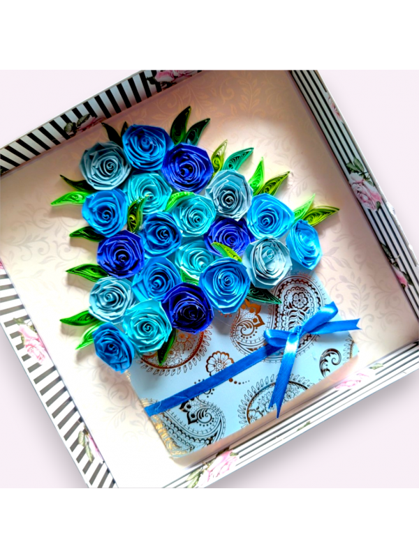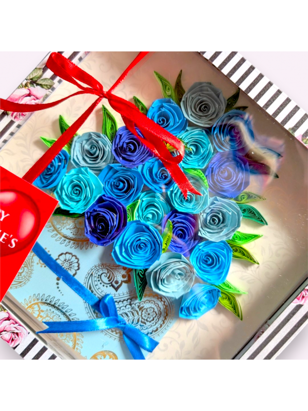 Valentine Quilled greeting card in box - Blue Roses and inside of the card, you can write a message and paste a picture.